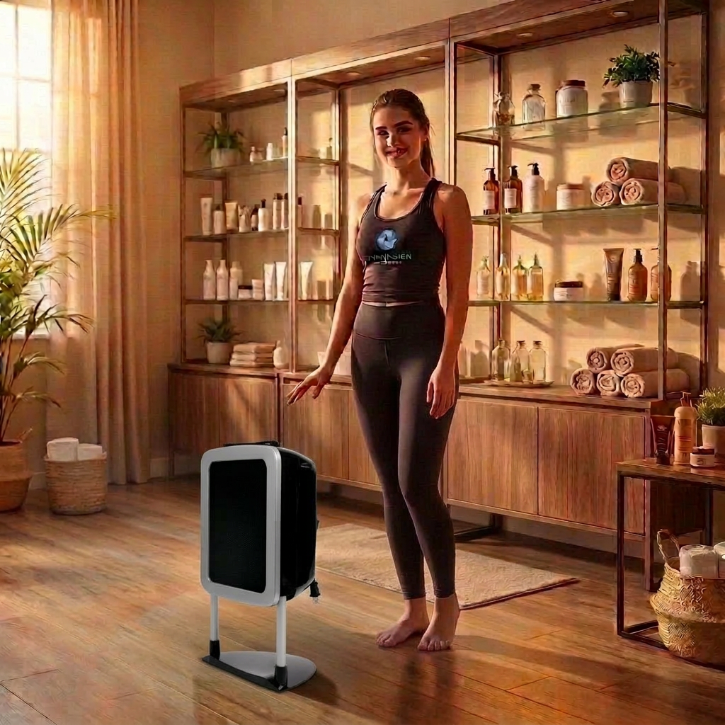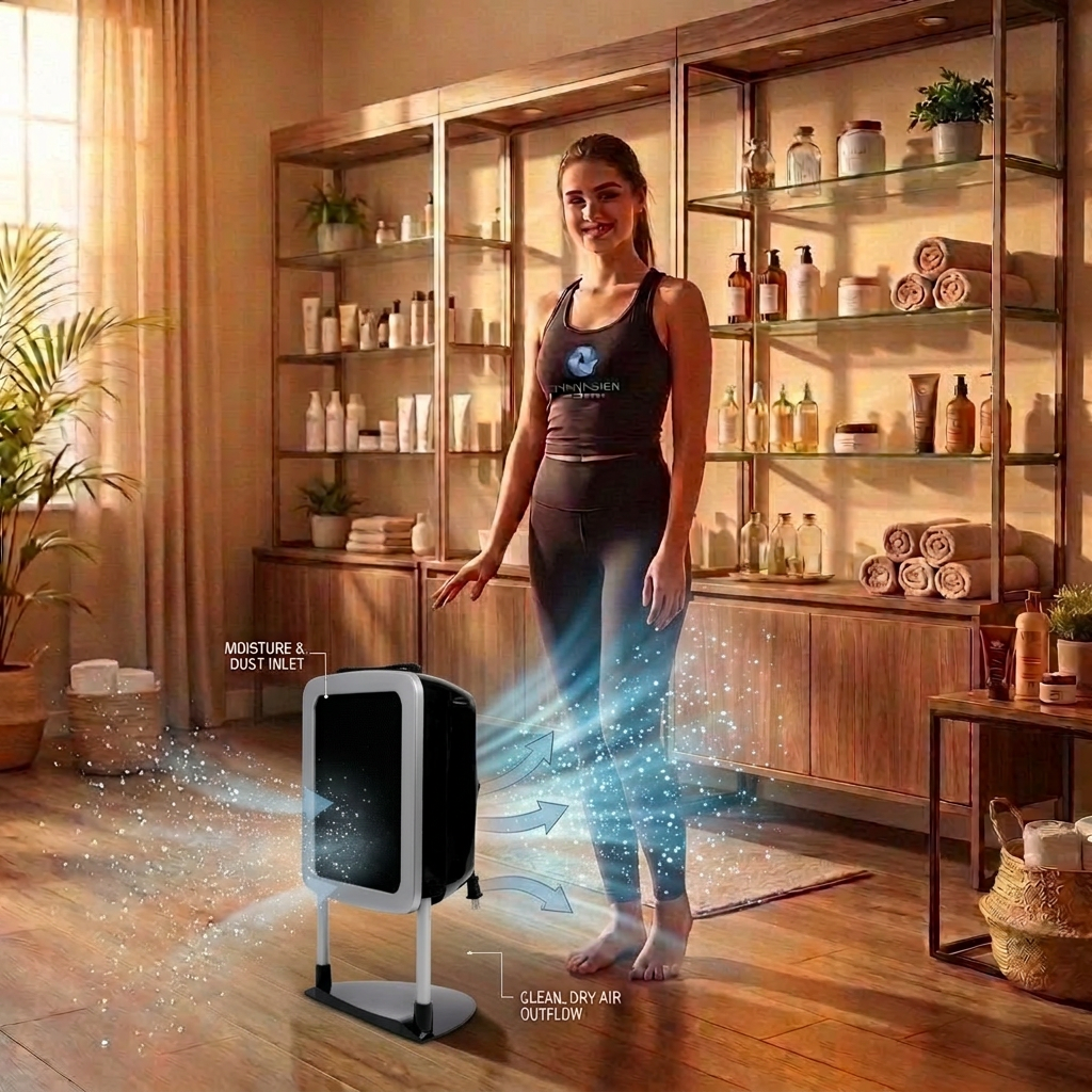 At the heart of the Wave Mini is a high-efficiency centrifugal extraction system engineered to pull overspray directly through a multi-layer filtration system. This design helps reduce airborne particles and prevents tan residue from spreading through the room, which is especially important in salons where multiple sessions are performed daily. By actively controlling overspray, the fan not only improves air quality but also helps protect surrounding equipment, walls, and floors from buildup.